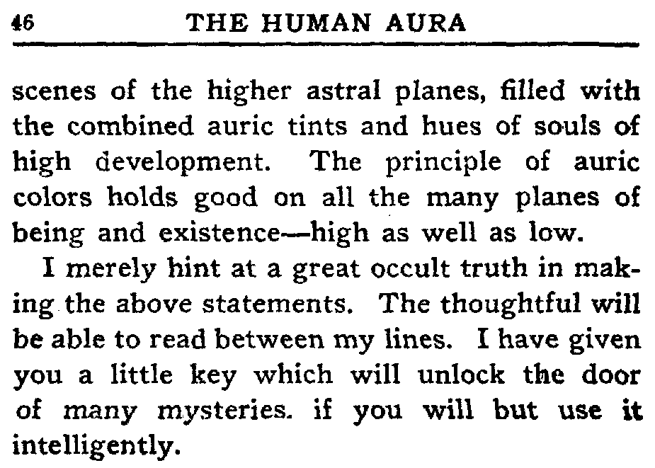 I merely hint at a great occult truth in making the above statements. The thoughtful will be able to read between my lines. I have given you a little key which will unlock the door of many mysteries, if you will but use it intelligently.