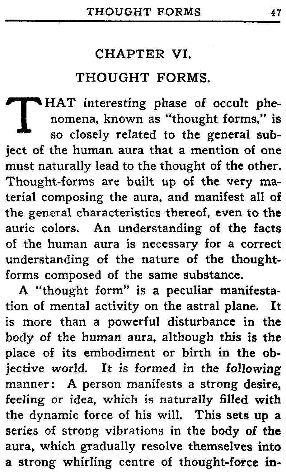 A "thought form" is a peculiar manifestation of mental activity on the astral plane. It is more than a powerful disturbance in the body of the human aura, although this is the place of its embodiment or birth in the objective world. It is formed in the following manner: A person manifests a strong desire, feeling or idea, which is naturally filled with the dynamic force of his will. This sets up a series of strong vibrations in the body of the aura, which gradually resolve themselves into a strong whirling centre of thought-force involved[48] in a mass of strongly cohesive auric substance, and strongly charged with the power of the prana of the person.