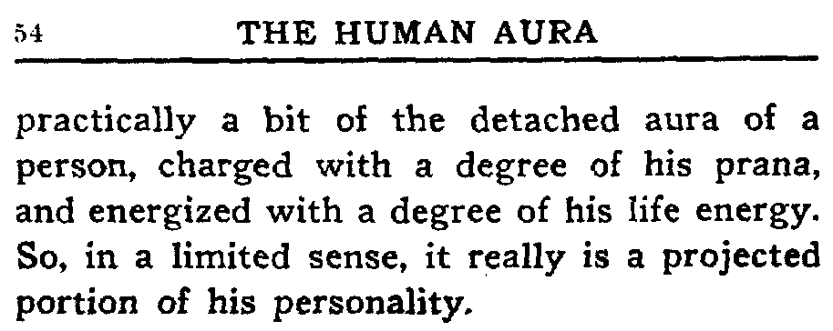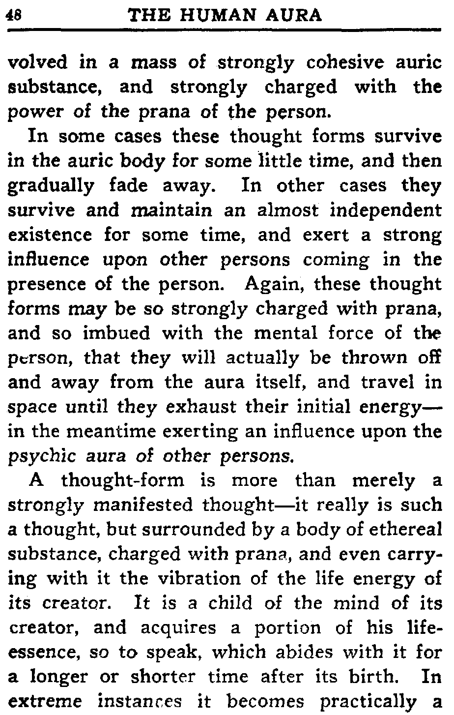 Finally, remember this: A thought form is[54] practically a bit of the detached aura of a person, charged with a degree of his prana, and energized with a degree of his life energy. So, in a limited sense, it really is a projected portion of his personality.