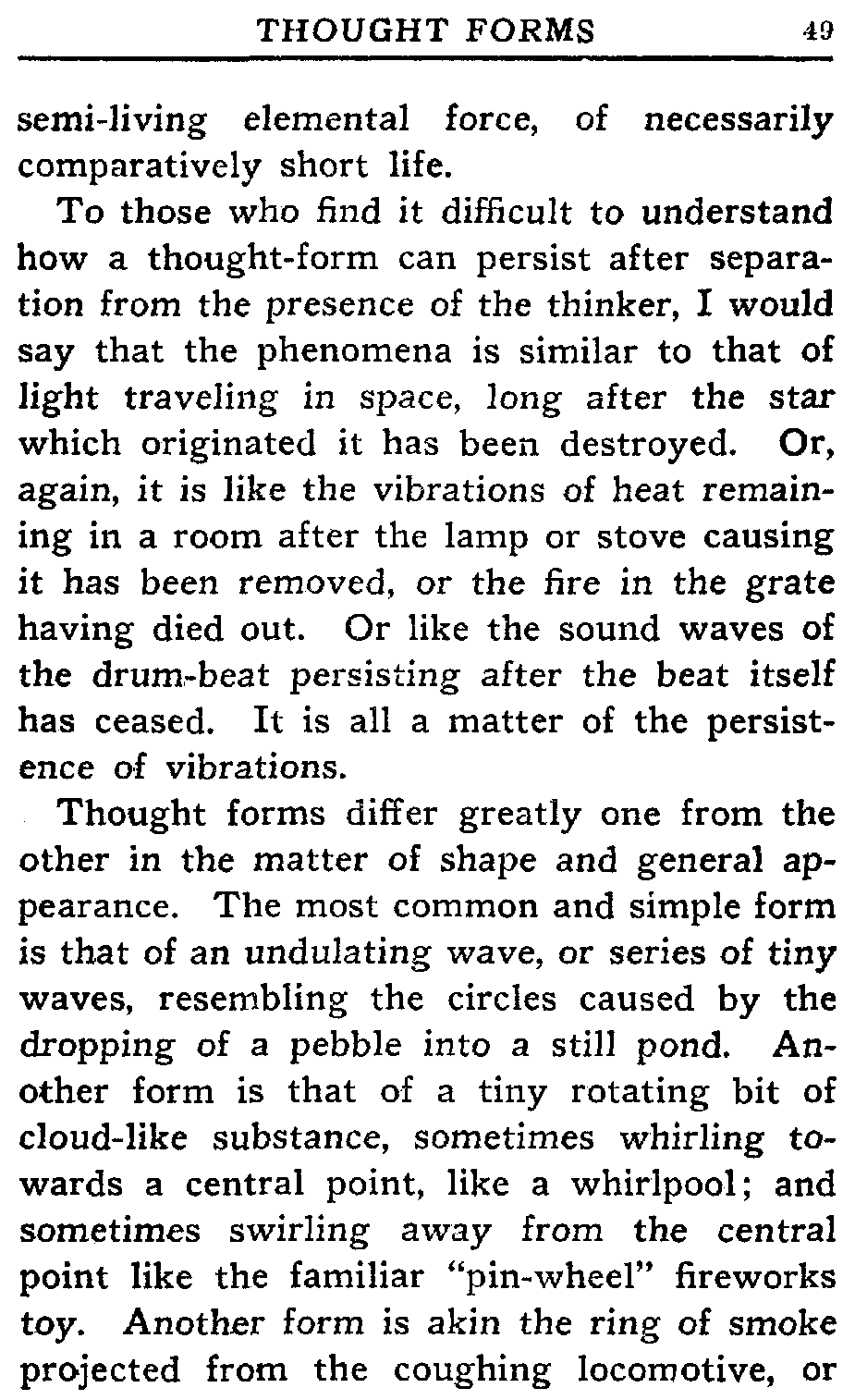 To those who find it difficult to understand how a thought-form can persist after separation from the presence of the thinker, I would say that the phenomena is similar to that of light traveling in space, long after the star which originated it has been destroyed. Or, again, it is like the vibrations of heat remaining in a room after the lamp or stove causing it has been removed, or the fire in the grate having died out. Or like the sound waves of the drum-beat persisting after the beat itself has ceased. It is all a matter of the persistence of vibrations.