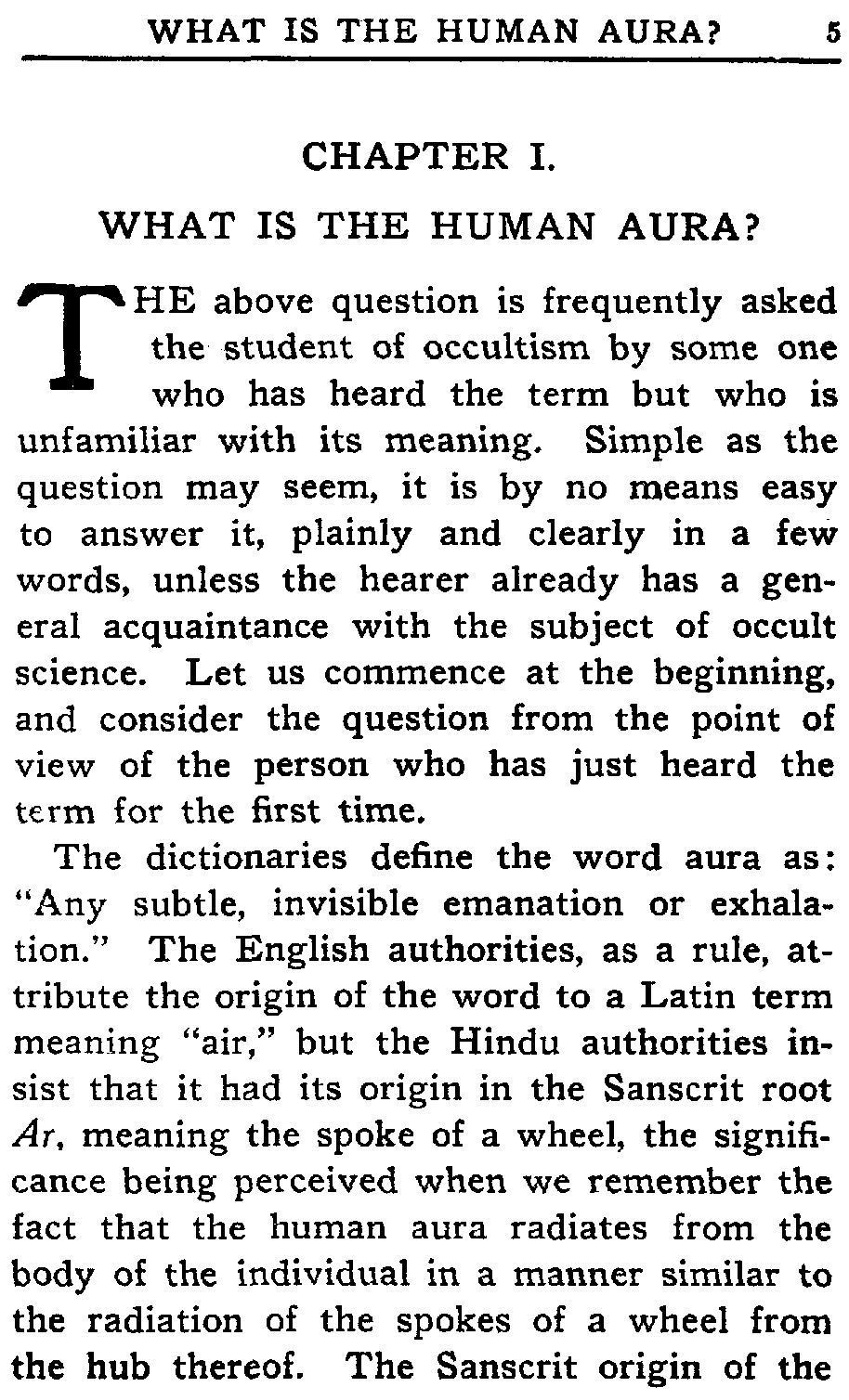 The dictionaries define the word aura as: "Any subtle, invisible emanation or exhalation." The English authorities, as a rule, attribute the origin of the word to a Latin term meaning "air," but the Hindu authorities insist that it had its origin in the Sanscrit root Ar, meaning the spoke of a wheel, the significance being perceived when we remember the fact that the human aura radiates from the body of the individual in a manner similar to the radiation of the spokes of a wheel from the hub thereof. The Sanscrit origin of the[6] term is the one preferred by occultists, although it will be seen that the idea of an aerial emanation, indicated by the Latin root, is not foreign to the real significance of the term.