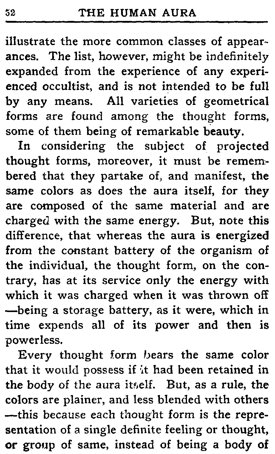 In considering the subject of projected thought forms, moreover, it must be remembered that they partake of, and manifest, the same colors as does the aura itself, for they are composed of the same material and are charged with the same energy. But, note this difference, that whereas the aura is energized from the constant battery of the organism of the individual, the thought form, on the contrary, has at its service only the energy with which it was charged when it was thrown off—being a storage battery, as it were, which in time expends all of its power and then is powerless.