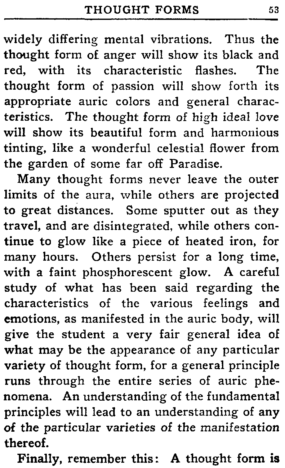 Many thought forms never leave the outer limits of the aura, while others are projected to great distances. Some sputter out as they travel, and are disintegrated, while others continue to glow like a piece of heated iron, for many hours. Others persist for a long time, with a faint phosphorescent glow. A careful study of what has been said regarding the characteristics of the various feelings and emotions, as manifested in the auric body, will give the student a very fair general idea of what may be the appearance of any particular variety of thought form, for a general principle runs through the entire series of auric phenomena. An understanding of the fundamental principles will lead to an understanding of any of the particular varieties of the manifestation thereof.