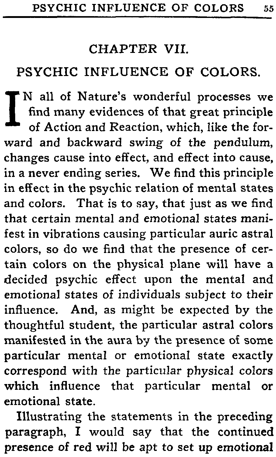 In all of Nature's wonderful processes we find many evidences of that great principle of Action and Reaction, which, like the forward and backward swing of the pendulum, changes cause into effect, and effect into cause, in a never ending series. We find this principle in effect in the psychic relation of mental states and colors. That is to say, that just as we find that certain mental and emotional states manifest in vibrations causing particular auric astral colors, so do we find that the presence of certain colors on the physical plane will have a decided psychic effect upon the mental and emotional states of individuals subject to their influence. And, as might be expected by the thoughtful student, the particular astral colors manifested in the aura by the presence of some particular mental or emotional state exactly correspond with the particular physical colors which influence that particular mental or emotional state.