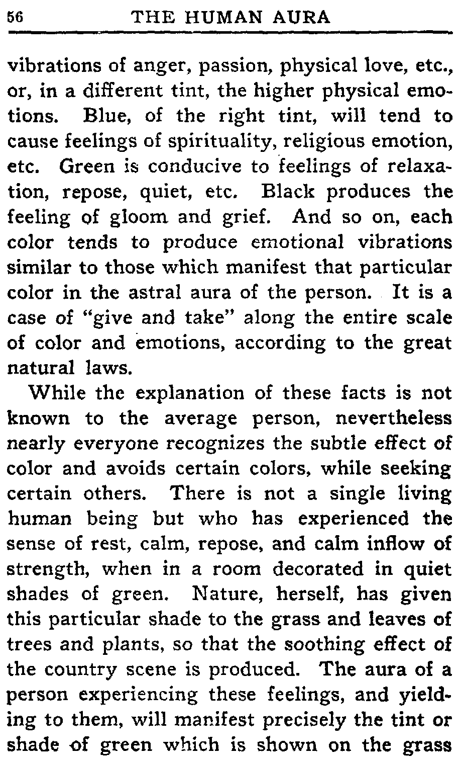 While the explanation of these facts is not known to the average person, nevertheless nearly everyone recognizes the subtle effect of color and avoids certain colors, while seeking certain others. There is not a single living human being but who has experienced the sense of rest, calm, repose, and calm inflow of strength, when in a room decorated in quiet shades of green. Nature, herself, has given this particular shade to the grass and leaves of trees and plants, so that the soothing effect of the country scene is produced. The aura of a person experiencing these feelings, and yielding to them, will manifest precisely the tint or shade of green which is shown on the grass[57] and leaves around him, so true is this natural law of action and reaction.