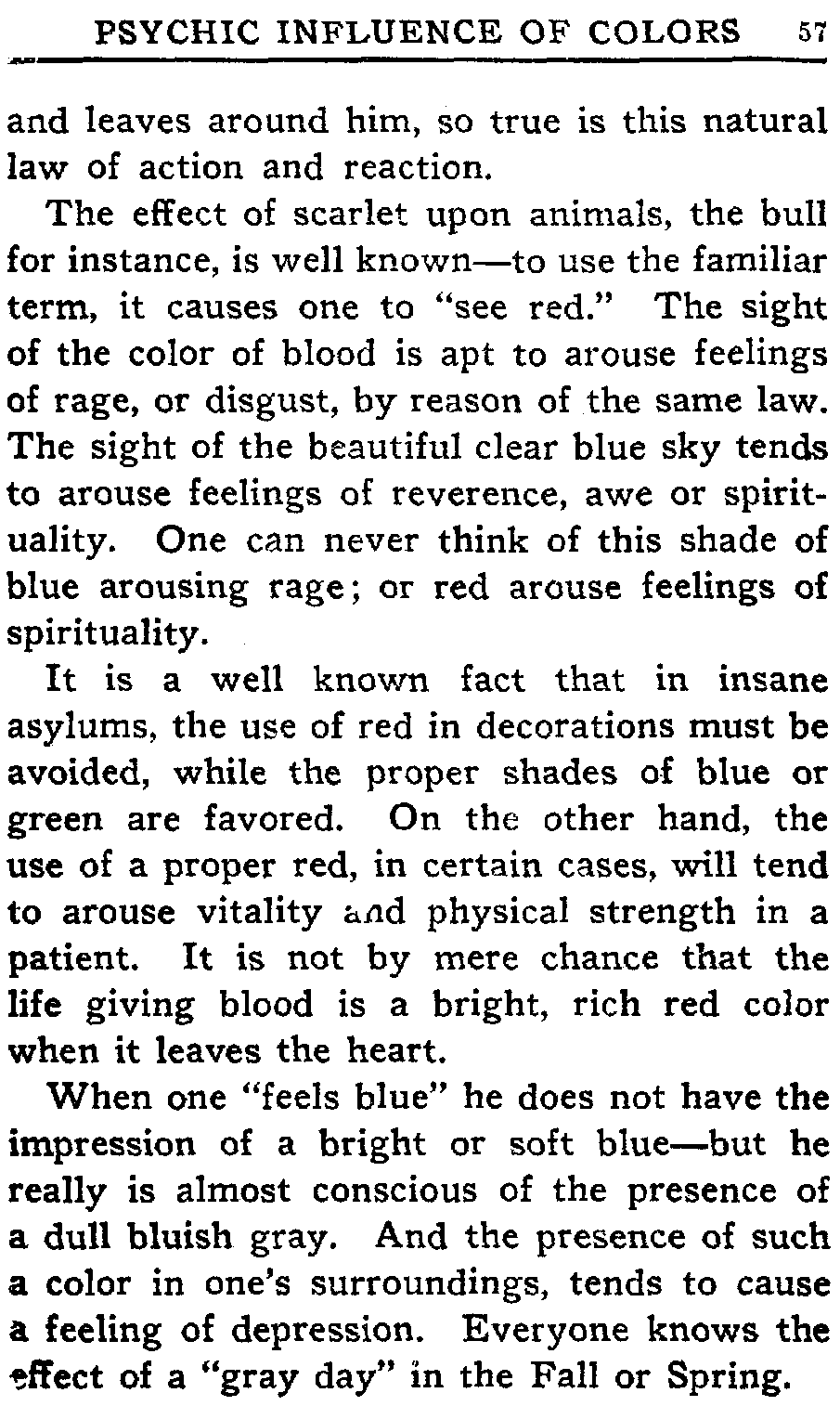The effect of scarlet upon animals, the bull for instance, is well known—to use the familiar term, it causes one to "see red." The sight of the color of blood is apt to arouse feelings of rage, or disgust, by reason of the same law. The sight of the beautiful clear blue sky tends to arouse feelings of reverence, awe or spirituality. One can never think of this shade of blue arousing rage; or red arouse feelings of spirituality.