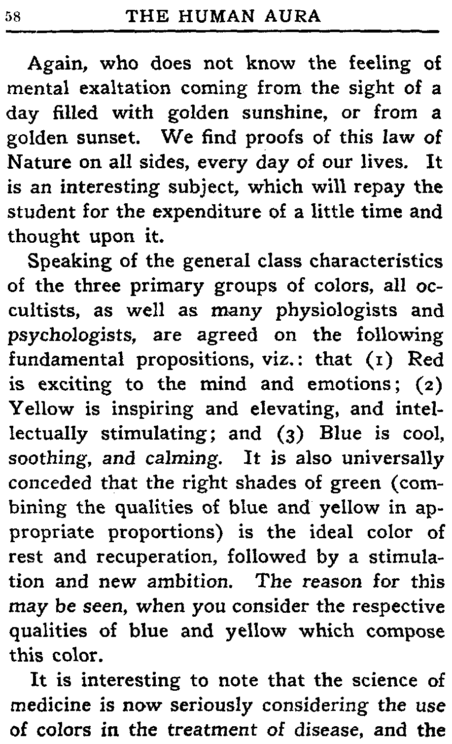 Speaking of the general class characteristics of the three primary groups of colors, all occultists, as well as many physiologists and psychologists, are agreed on the following fundamental propositions, viz.: that (1) Red is exciting to the mind and emotions; (2) Yellow is inspiring and elevating, and intellectually stimulating; and (3) Blue is cool, soothing, and calming. It is also universally conceded that the right shades of green (combining the qualities of blue and yellow in appropriate proportions) is the ideal color of rest and recuperation, followed by a stimulation and new ambition. The reason for this may be seen, when you consider the respective qualities of blue and yellow which compose this color.