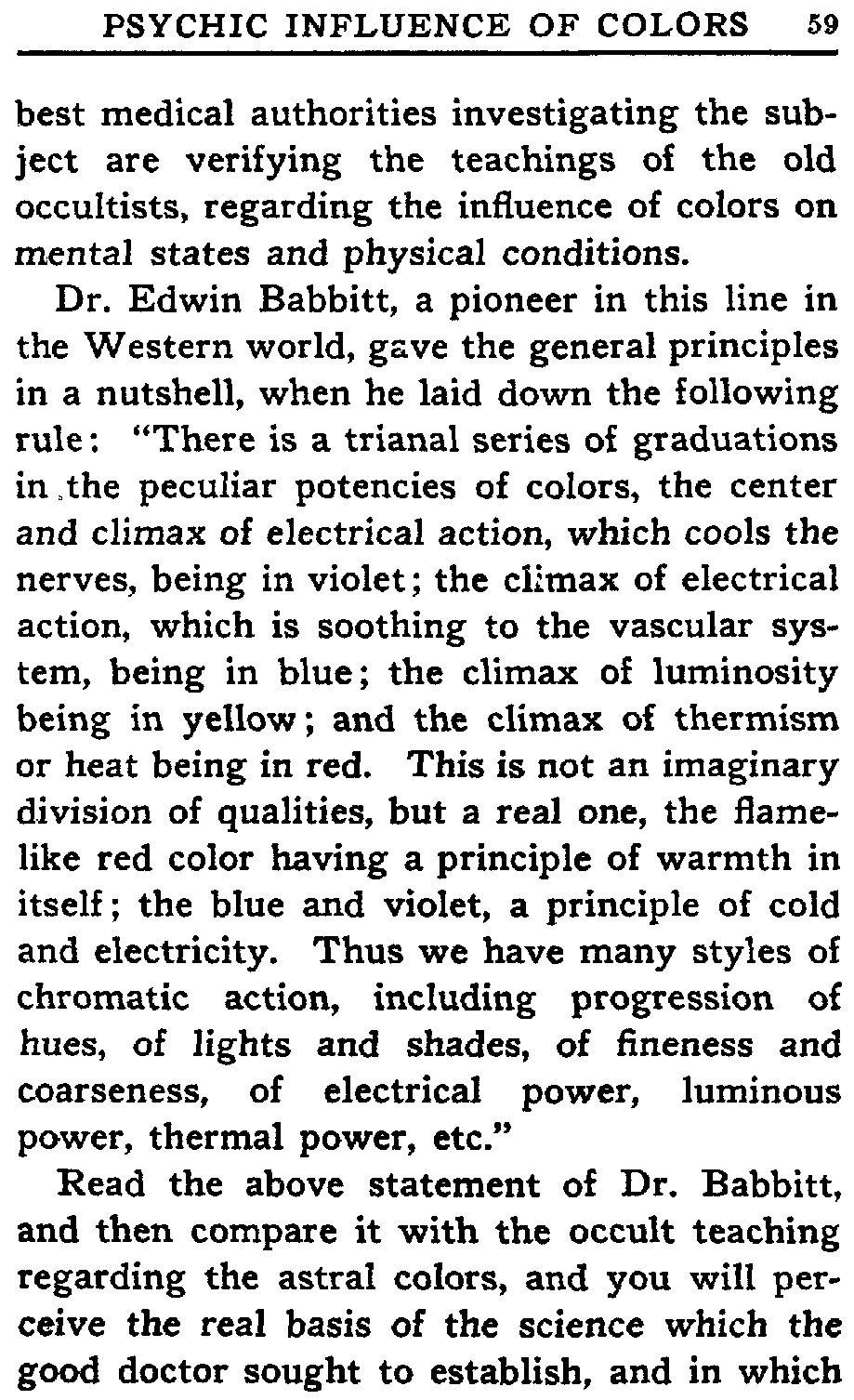 Read the above statement of Dr. Babbitt, and then compare it with the occult teaching regarding the astral colors, and you will perceive the real basis of the science which the good doctor sought to establish, and in which[60] cause he did such excellent pioneer work. The result of his work is now being elaborated by modern physicians in the great schools of medicine, particularly on the Continent, in Europe—England and America being somewhat behind the times in this work.