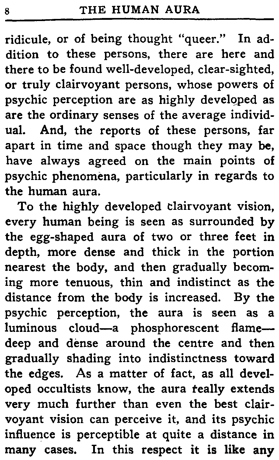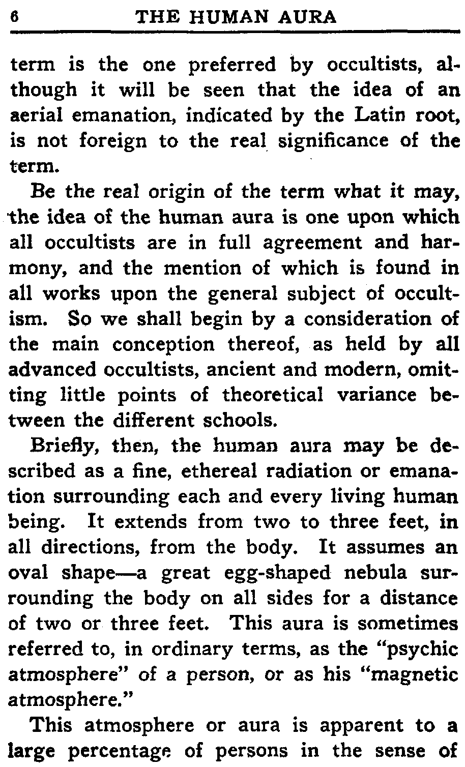 Briefly, then, the human aura may be described as a fine, ethereal radiation or emanation surrounding each and every living human being. It extends from two to three feet, in all directions, from the body. It assumes an oval shape—a great egg-shaped nebula surrounding the body on all sides for a distance of two or three feet. This aura is sometimes referred to, in ordinary terms, as the "psychic atmosphere" of a person, or as his "magnetic atmosphere."