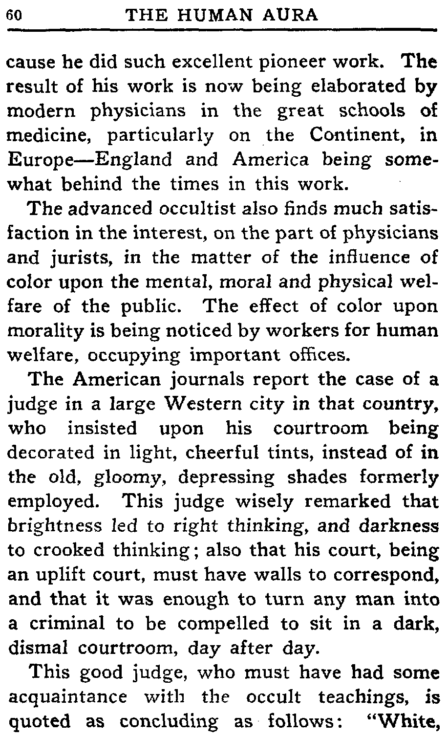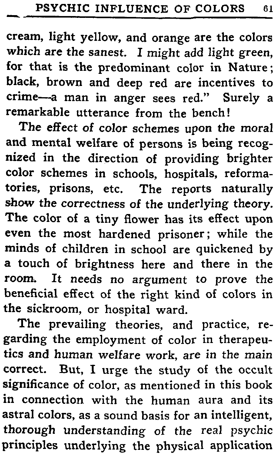 This good judge, who must have had some acquaintance with the occult teachings, is quoted as concluding as follows: "White,[61] cream, light yellow, and orange are the colors which are the sanest. I might add light green, for that is the predominant color in Nature; black, brown and deep red are incentives to crime—a man in anger sees red." Surely a remarkable utterance from the bench!