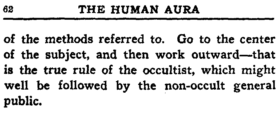 The prevailing theories, and practice, regarding the employment of color in therapeutics and human welfare work, are in the main correct. But, I urge the study of the occult significance of color, as mentioned in this book in connection with the human aura and its astral colors, as a sound basis for an intelligent, thorough understanding of the real psychic principles underlying the physical application[62] of the methods referred to. Go to the center of the subject, and then work outward—that is the true rule of the occultist, which might well be followed by the non-occult general public.