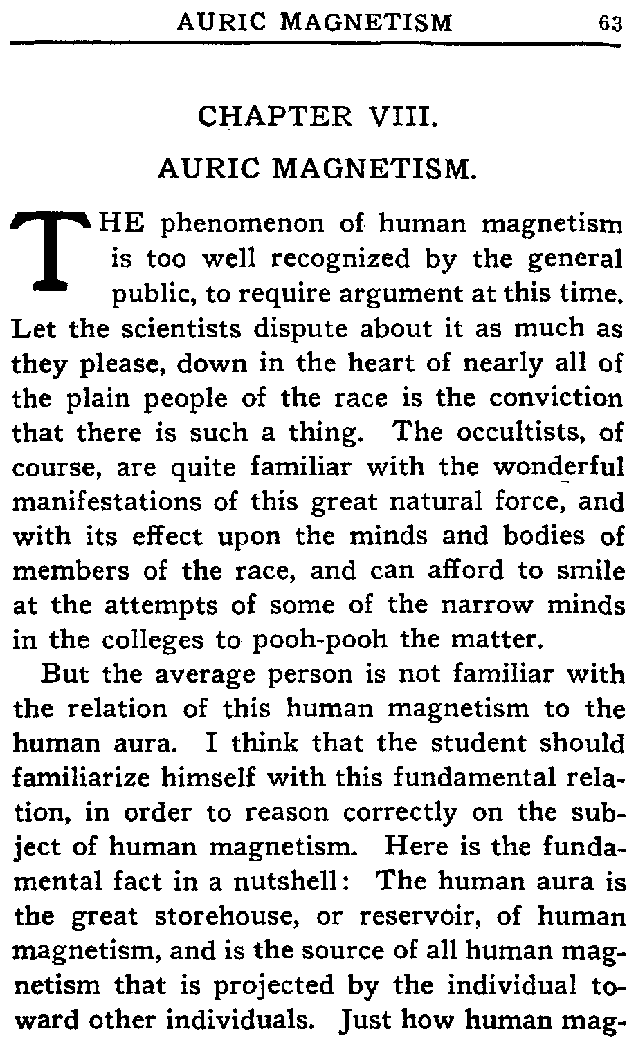 The phenomenon of human magnetism is too well recognized by the general public, to require argument at this time. Let the scientists dispute about it as much as they please, down in the heart of nearly all of the plain people of the race is the conviction that there is such a thing. The occultists, of course, are quite familiar with the wonderful manifestations of this great natural force, and with its effect upon the minds and bodies of members of the race, and can afford to smile at the attempts of some of the narrow minds in the colleges to pooh-pooh the matter.