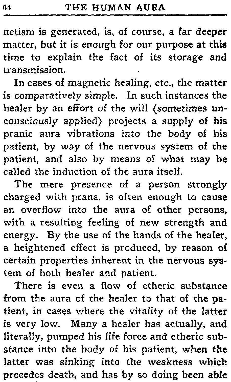 There is even a flow of etheric substance from the aura of the healer to that of the patient, in cases where the vitality of the latter is very low. Many a healer has actually, and literally, pumped his life force and etheric substance into the body of his patient, when the latter was sinking into the weakness which precedes death, and has by so doing been able[65] to bring him back to life and strength. This is practically akin to the transfusion of blood—except that it is on the psychic plane instead of the physical.