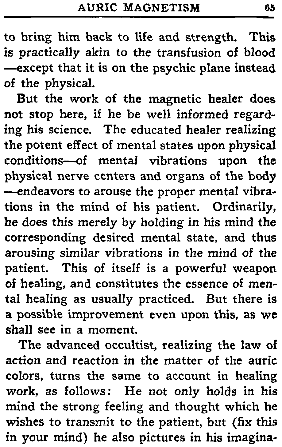 In cases of magnetic healing, etc., the matter is comparatively simple. In such instances the healer by an effort of the will (sometimes unconsciously applied) projects a supply of his pranic aura vibrations into the body of his patient, by way of the nervous system of the patient, and also by means of what may be called the induction of the aura itself.