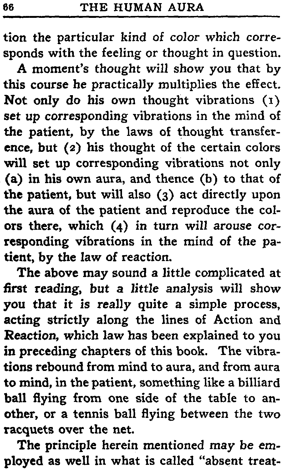 The above may sound a little complicated at first reading, but a little analysis will show you that it is really quite a simple process, acting strictly along the lines of Action and Reaction, which law has been explained to you in preceding chapters of this book. The vibrations rebound from mind to aura, and from aura to mind, in the patient, something like a billiard ball flying from one side of the table to another, or a tennis ball flying between the two racquets over the net.