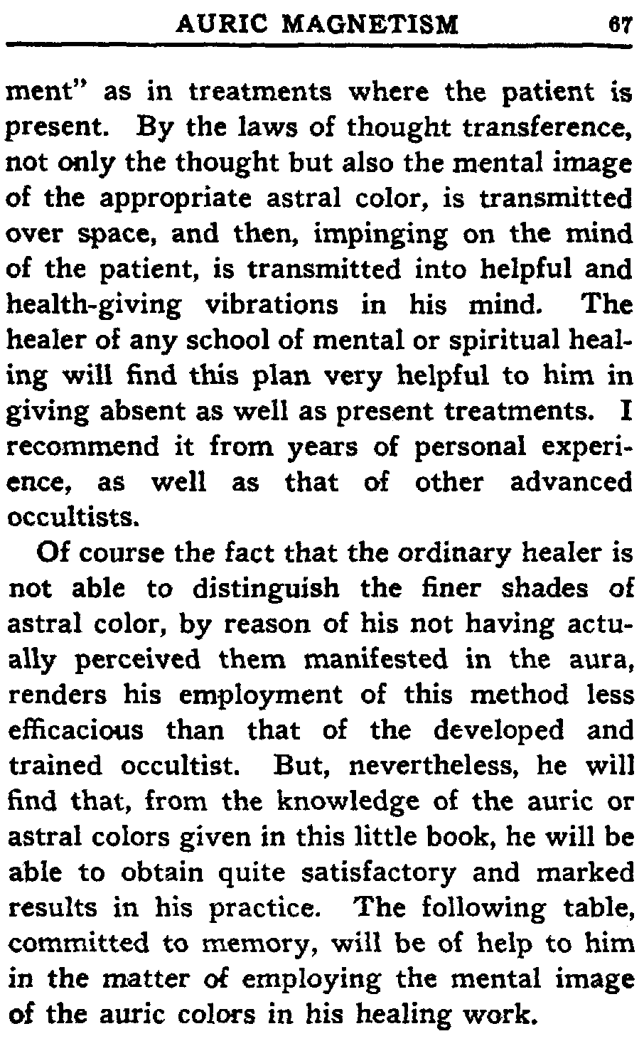 The principle herein mentioned may be employed as well in what is called "absent treatment"[67] as in treatments where the patient is present. By the laws of thought transference, not only the thought but also the mental image of the appropriate astral color, is transmitted over space, and then, impinging on the mind of the patient, is transmitted into helpful and health-giving vibrations in his mind. The healer of any school of mental or spiritual healing will find this plan very helpful to him in giving absent as well as present treatments. I recommend it from years of personal experience, as well as that of other advanced occultists.