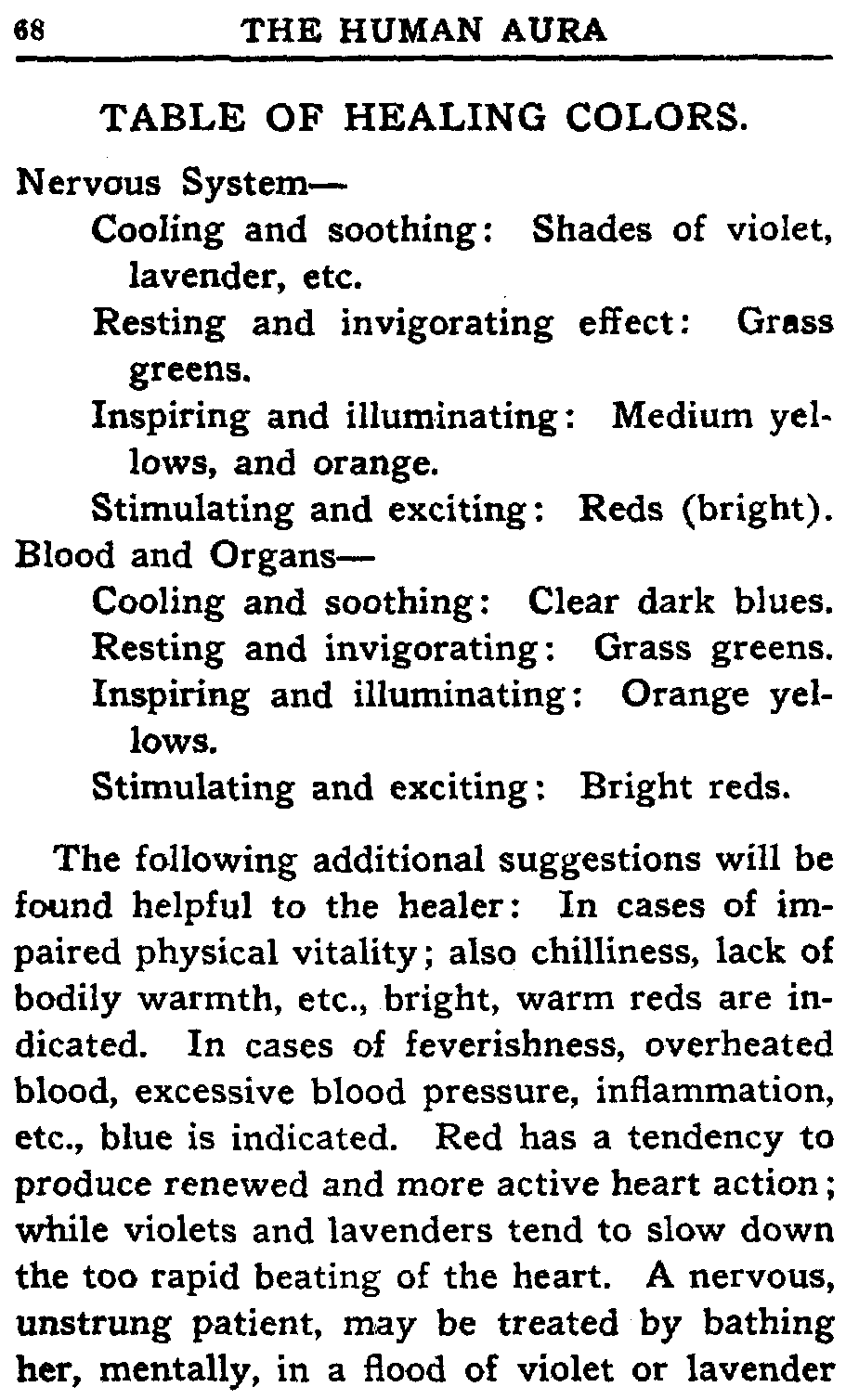 The following additional suggestions will be found helpful to the healer: In cases of impaired physical vitality; also chilliness, lack of bodily warmth, etc., bright, warm reds are indicated. In cases of feverishness, overheated blood, excessive blood pressure, inflammation, etc., blue is indicated. Red has a tendency to produce renewed and more active heart action; while violets and lavenders tend to slow down the too rapid beating of the heart. A nervous, unstrung patient, may be treated by bathing her, mentally, in a flood of violet or lavender[69] auric color; while a tired, used up, fatigued person may be invigorated by flooding him with bright reds, followed by bright, rich yellows, finishing the treatment with a steady flow of warm orange color.