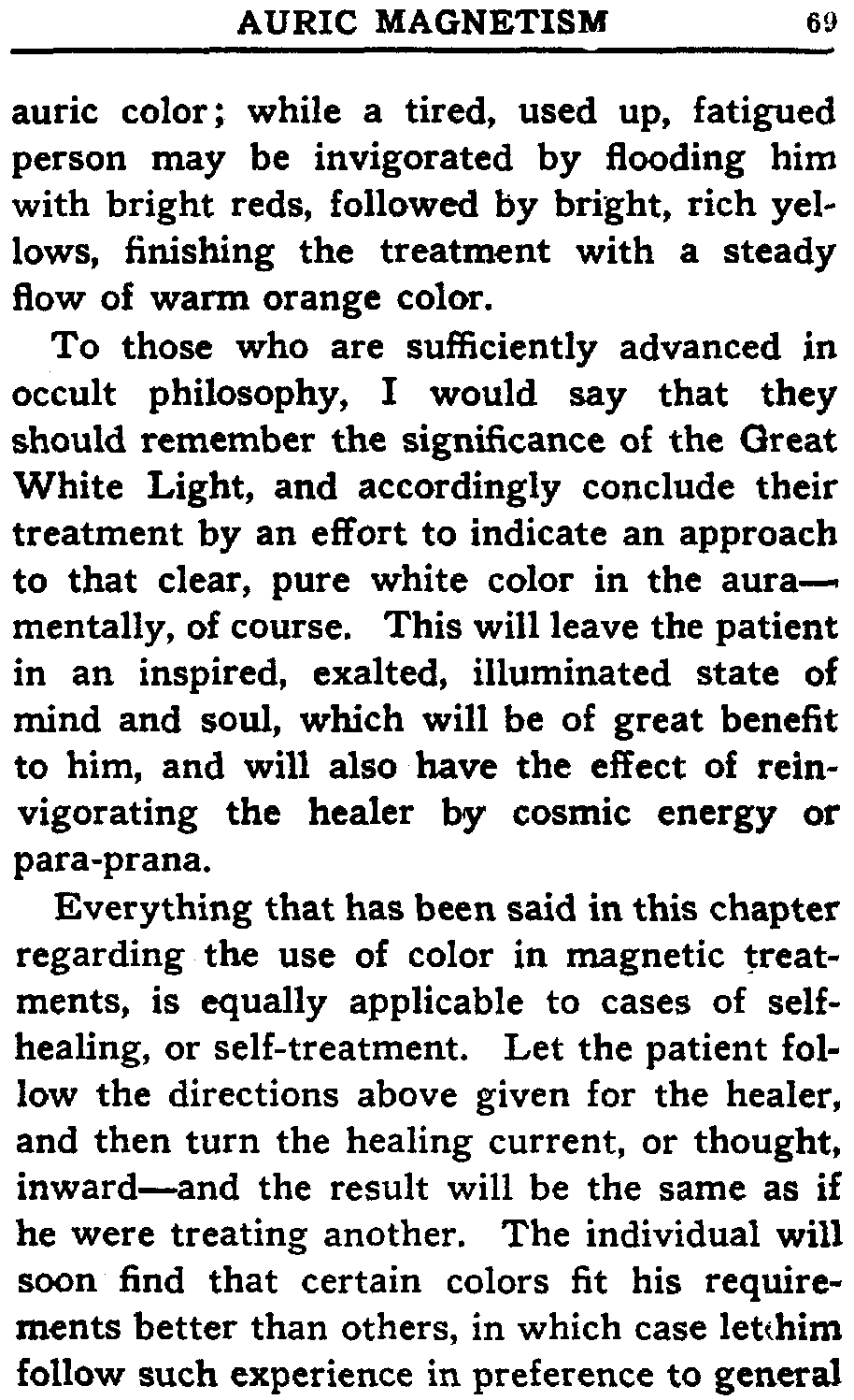 To those who are sufficiently advanced in occult philosophy, I would say that they should remember the significance of the Great White Light, and accordingly conclude their treatment by an effort to indicate an approach to that clear, pure white color in the aura—mentally, of course. This will leave the patient in an inspired, exalted, illuminated state of mind and soul, which will be of great benefit to him, and will also have the effect of reinvigorating the healer by cosmic energy or para-prana.