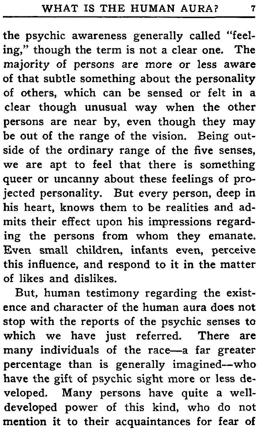 This atmosphere or aura is apparent to a large percentage of persons in the sense of[7] the psychic awareness generally called "feeling," though the term is not a clear one. The majority of persons are more or less aware of that subtle something about the personality of others, which can be sensed or felt in a clear though unusual way when the other persons are near by, even though they may be out of the range of the vision. Being outside of the ordinary range of the five senses, we are apt to feel that there is something queer or uncanny about these feelings of projected personality. But every person, deep in his heart, knows them to be realities and admits their effect upon his impressions regarding the persons from whom they emanate. Even small children, infants even, perceive this influence, and respond to it in the matter of likes and dislikes.