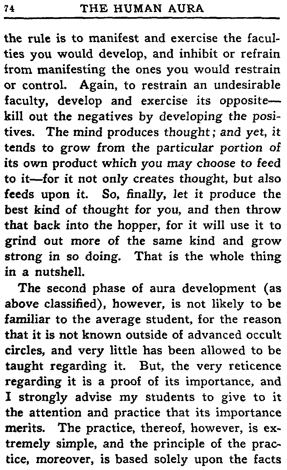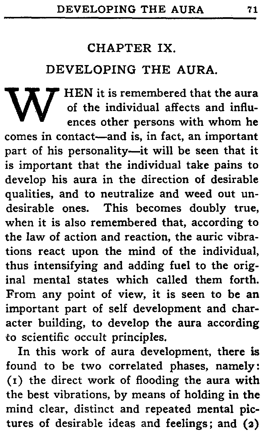 In this work of aura development, there is found to be two correlated phases, namely: (1) the direct work of flooding the aura with the best vibrations, by means of holding in the mind clear, distinct and repeated mental pictures of desirable ideas and feelings; and (2)[72] the added effect of mental images of the colors corresponding to the ideas and feelings which are deemed desirable and worthy of development.
