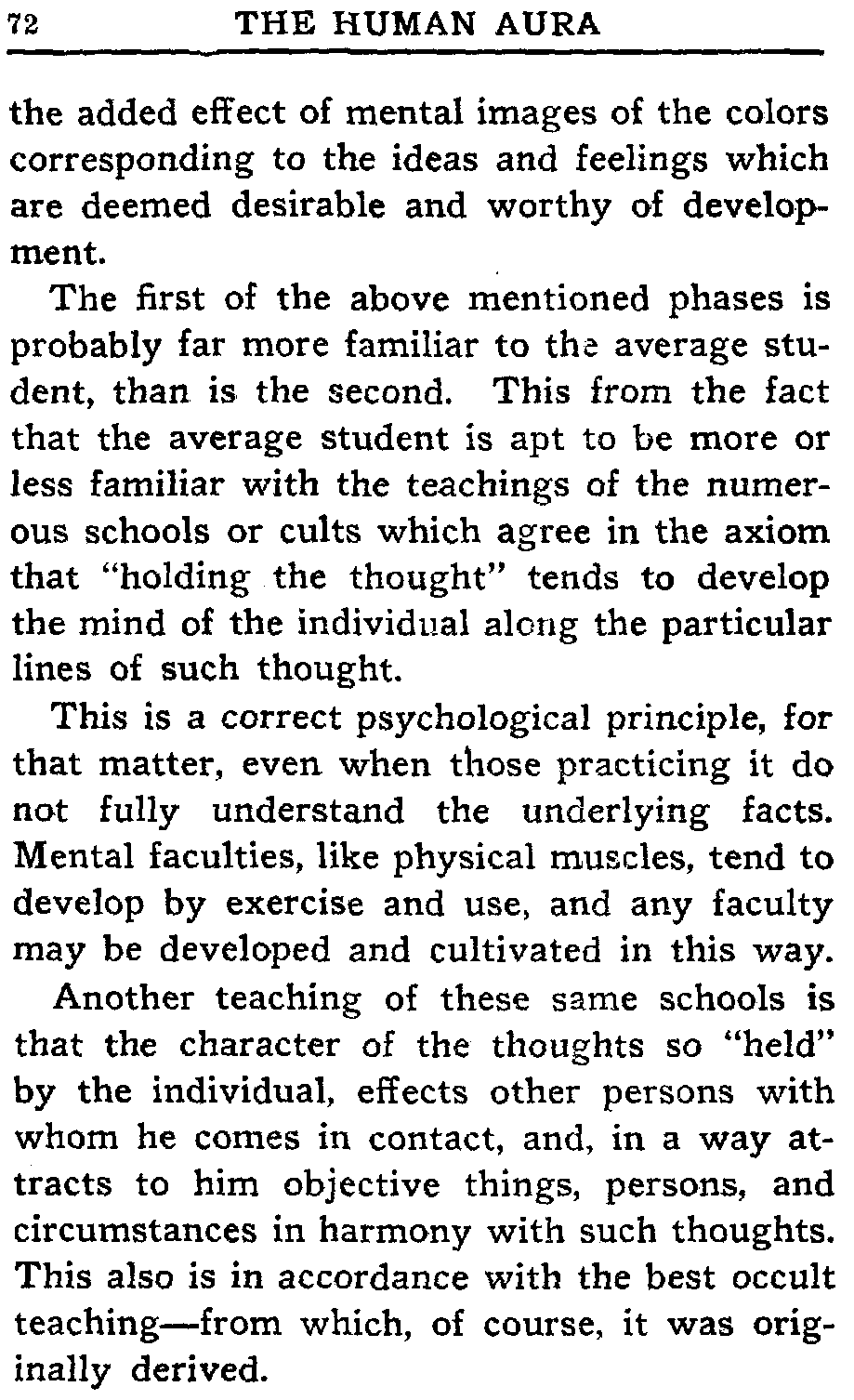 Another teaching of these same schools is that the character of the thoughts so "held" by the individual, effects other persons with whom he comes in contact, and, in a way attracts to him objective things, persons, and circumstances in harmony with such thoughts. This also is in accordance with the best occult teaching—from which, of course, it was originally derived.[73]