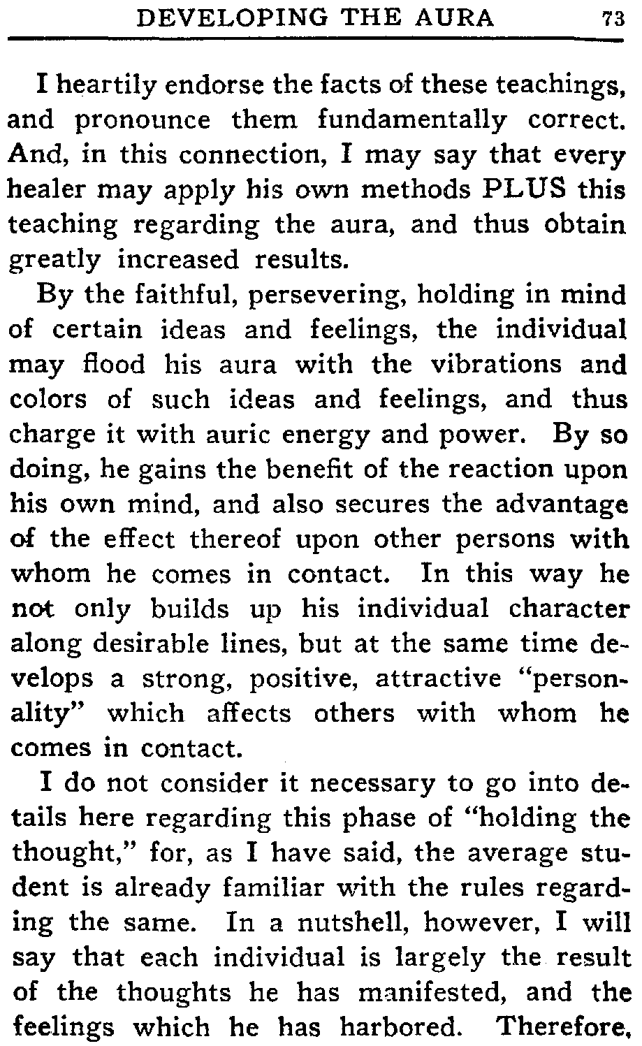 By the faithful, persevering, holding in mind of certain ideas and feelings, the individual may flood his aura with the vibrations and colors of such ideas and feelings, and thus charge it with auric energy and power. By so doing, he gains the benefit of the reaction upon his own mind, and also secures the advantage of the effect thereof upon other persons with whom he comes in contact. In this way he not only builds up his individual character along desirable lines, but at the same time develops a strong, positive, attractive "personality" which affects others with whom he comes in contact.