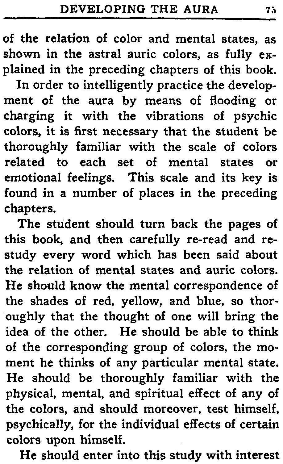 In order to intelligently practice the development of the aura by means of flooding or charging it with the vibrations of psychic colors, it is first necessary that the student be thoroughly familiar with the scale of colors related to each set of mental states or emotional feelings. This scale and its key is found in a number of places in the preceding chapters.