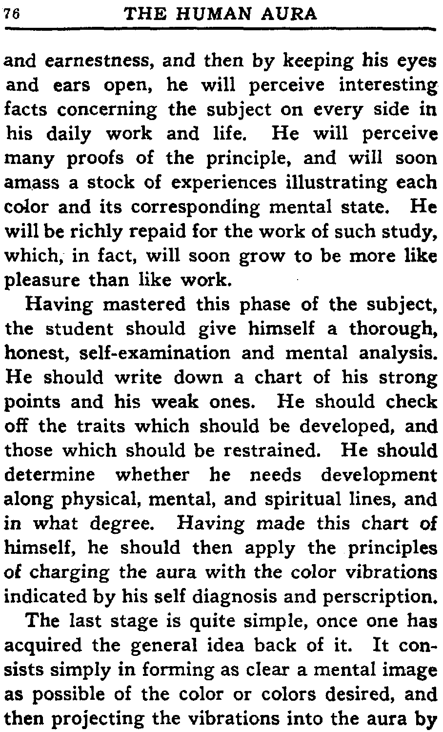 Having mastered this phase of the subject, the student should give himself a thorough, honest, self-examination and mental analysis. He should write down a chart of his strong points and his weak ones. He should check off the traits which should be developed, and those which should be restrained. He should determine whether he needs development along physical, mental, and spiritual lines, and in what degree. Having made this chart of himself, he should then apply the principles of charging the aura with the color vibrations indicated by his self diagnosis and prescription.