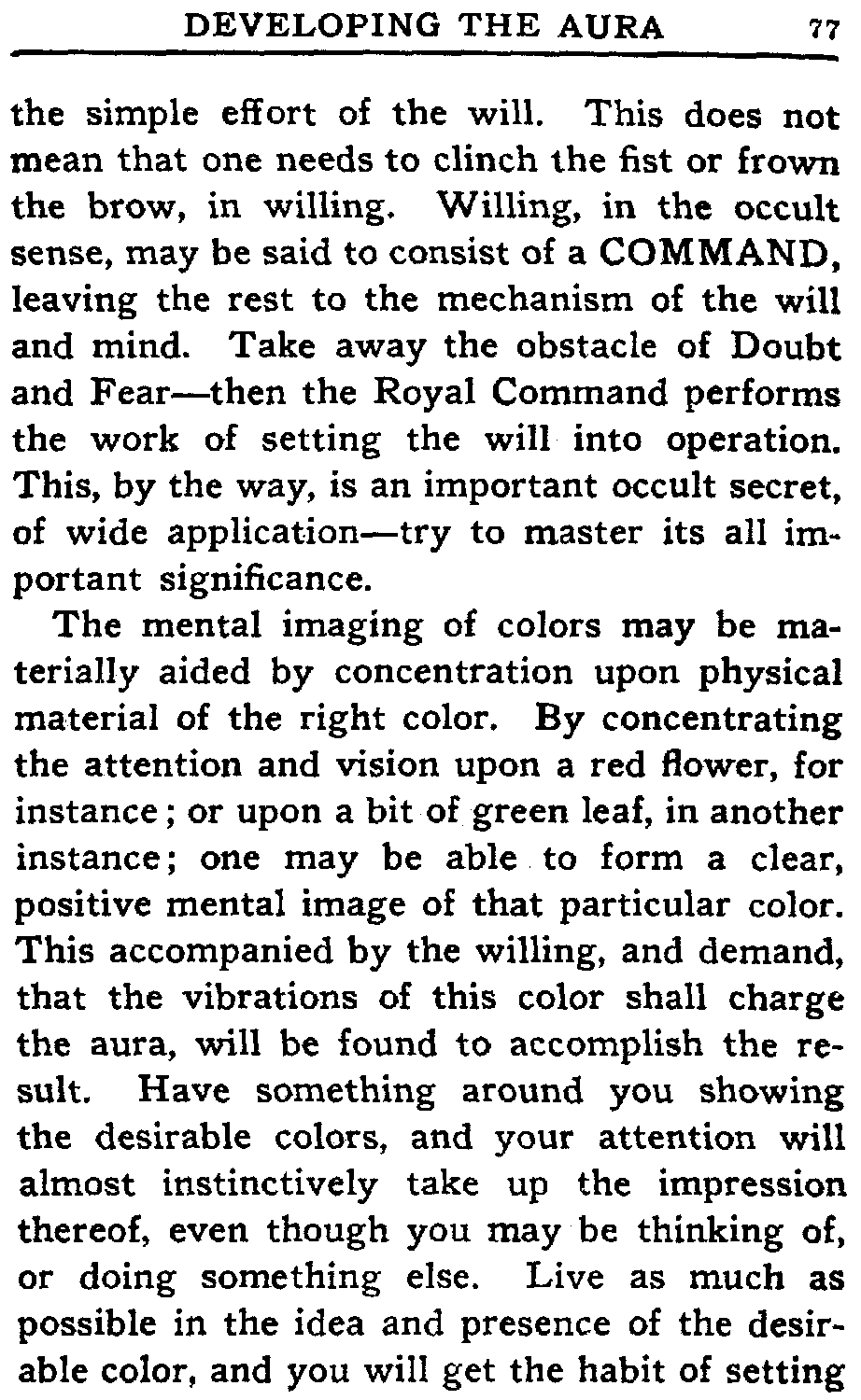 The last stage is quite simple, once one has acquired the general idea back of it. It consists simply in forming as clear a mental image as possible of the color or colors desired, and then projecting the vibrations into the aura by[77] the simple effort of the will. This does not mean that one needs to clinch the fist or frown the brow, in willing. Willing, in the occult sense, may be said to consist of a COMMAND, leaving the rest to the mechanism of the will and mind. Take away the obstacle of Doubt and Fear—then the Royal Command performs the work of setting the will into operation. This, by the way, is an important occult secret, of wide application—try to master its all important significance.