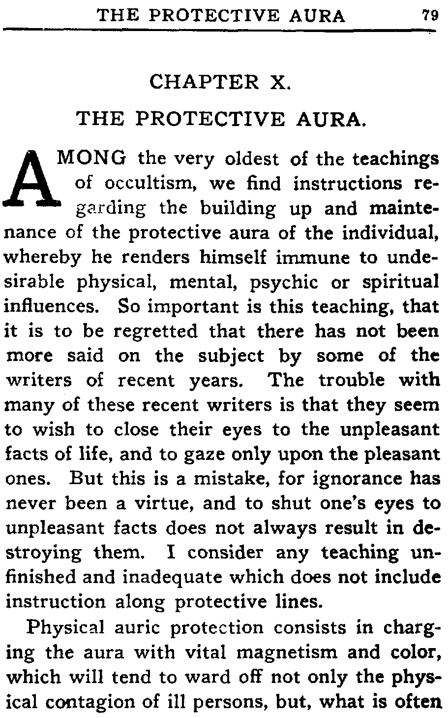 Among the very oldest of the teachings of occultism, we find instructions regarding the building up and maintenance of the protective aura of the individual, whereby he renders himself immune to undesirable physical, mental, psychic or spiritual influences. So important is this teaching, that it is to be regretted that there has not been more said on the subject by some of the writers of recent years. The trouble with many of these recent writers is that they seem to wish to close their eyes to the unpleasant facts of life, and to gaze only upon the pleasant ones. But this is a mistake, for ignorance has never been a virtue, and to shut one's eyes to unpleasant facts does not always result in destroying them. I consider any teaching unfinished and inadequate which does not include instruction along protective lines.