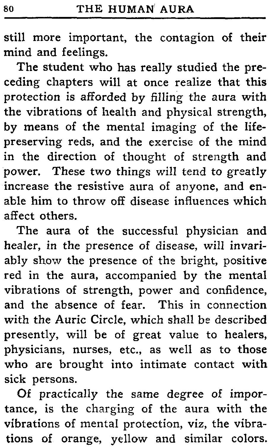 Physical auric protection consists in charging the aura with vital magnetism and color, which will tend to ward off not only the physical contagion of ill persons, but, what is often[80] still more important, the contagion of their mind and feelings.