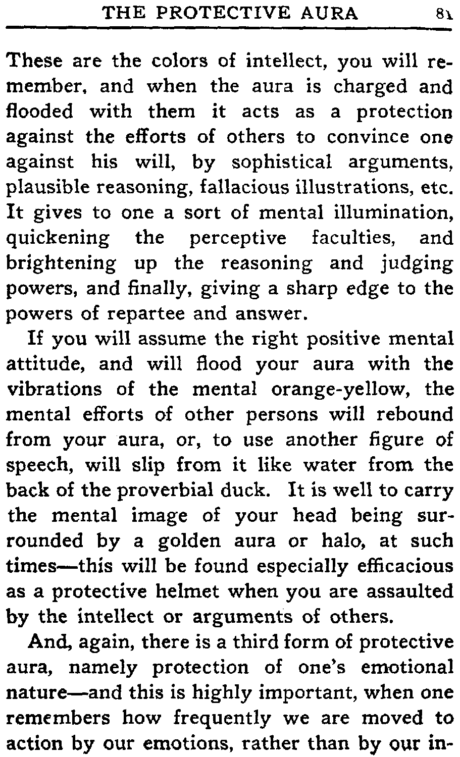 And, again, there is a third form of protective aura, namely protection of one's emotional nature—and this is highly important, when one remembers how frequently we are moved to action by our emotions, rather than by our intellect[82] or reason. To guard one's emotions, is to guard one's very inmost soul, so to speak. If we can protect our feeling and emotional side, we will be able to use our reasoning powers and intellect far more effectively, as all know by experience.