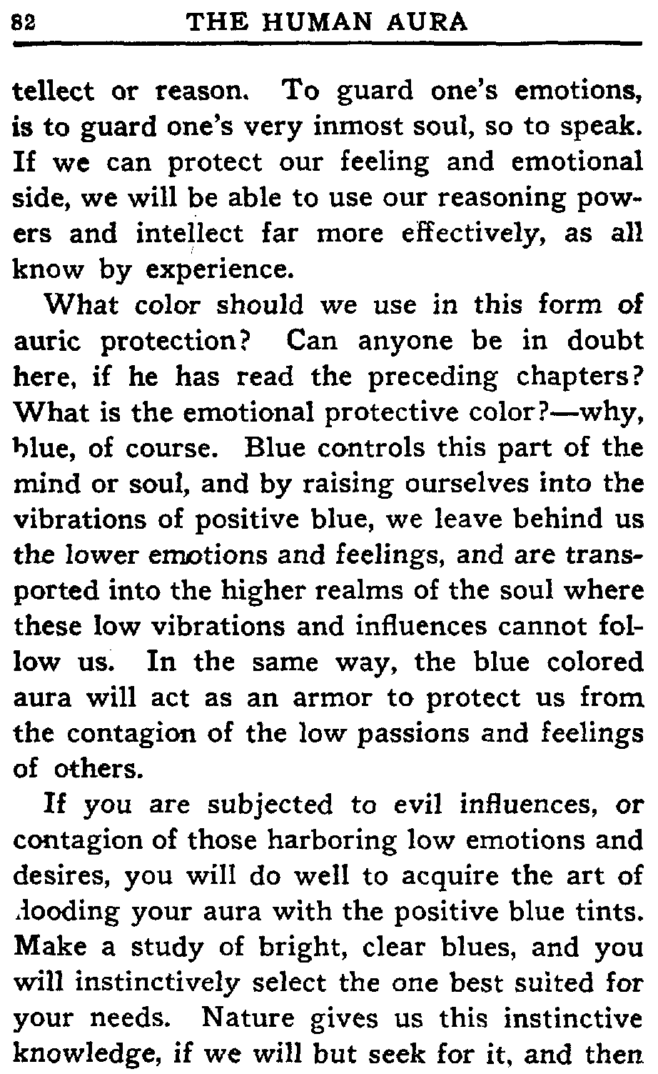 What color should we use in this form of auric protection? Can anyone be in doubt here, if he has read the preceding chapters? What is the emotional protective color?—why, blue, of course. Blue controls this part of the mind or soul, and by raising ourselves into the vibrations of positive blue, we leave behind us the lower emotions and feelings, and are transported into the higher realms of the soul where these low vibrations and influences cannot follow us. In the same way, the blue colored aura will act as an armor to protect us from the contagion of the low passions and feelings of others.