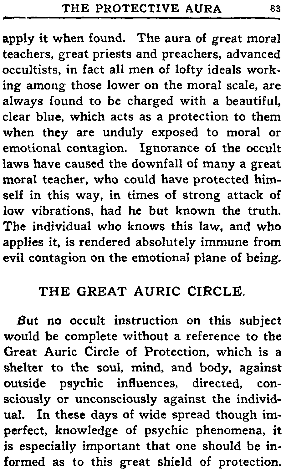 But no occult instruction on this subject would be complete without a reference to the Great Auric Circle of Protection, which is a shelter to the soul, mind, and body, against outside psychic influences, directed, consciously or unconsciously against the individual. In these days of wide spread though imperfect, knowledge of psychic phenomena, it is especially important that one should be informed as to this great shield of protection.[84] Omitting all reference to the philosophy underlying it, it may be said that this Auric Circle is formed by making the mental image, accompanied by the demand of will, of the aura being surrounded by a great band of PURE CLEAR WHITE LIGHT. A little perseverance will enable you to create this on the astral plane, and, though (unless you have the astral vision) you cannot see it actually, yet you will actually FEEL its protective presence, so that you will know that it is there guarding you.
