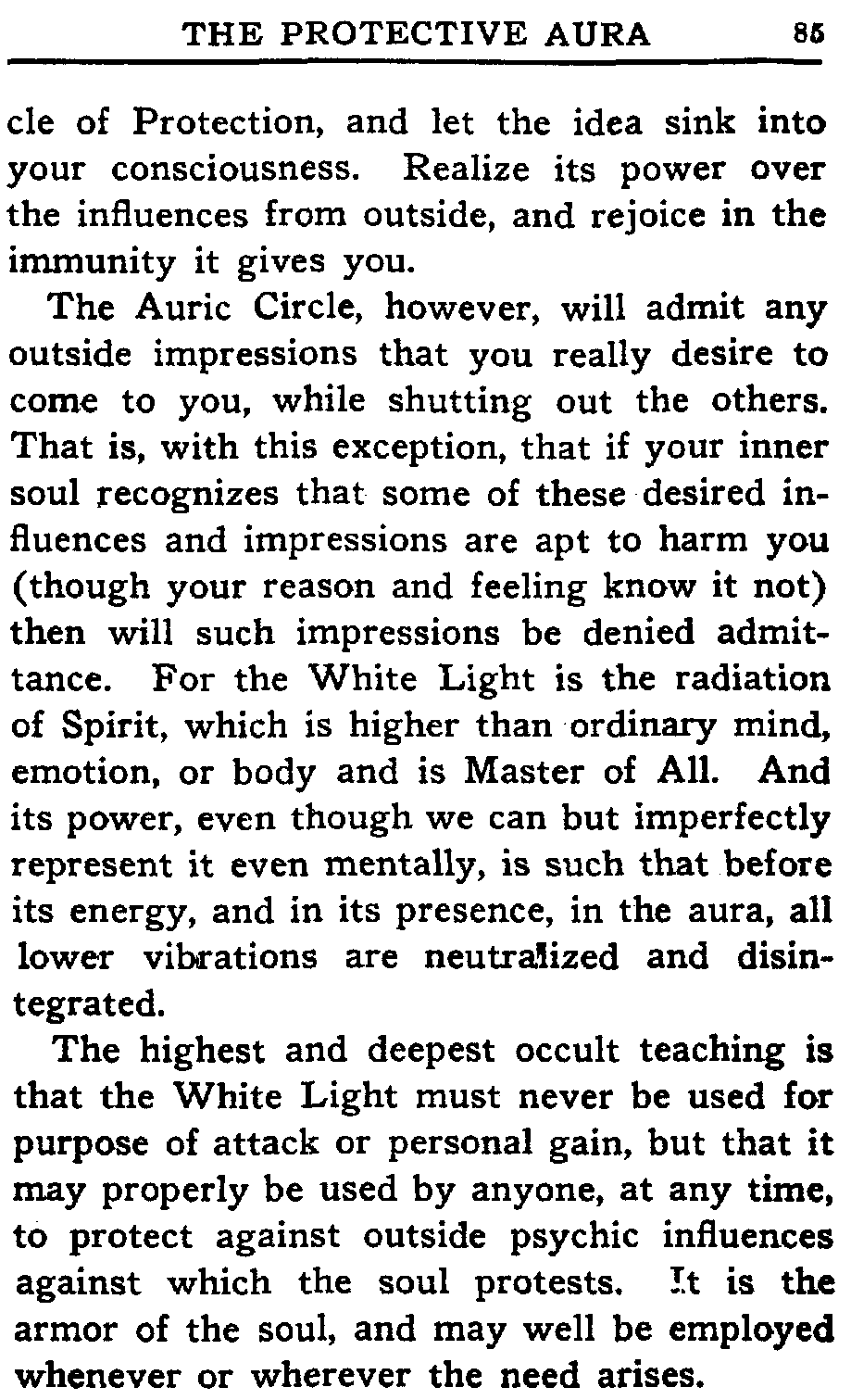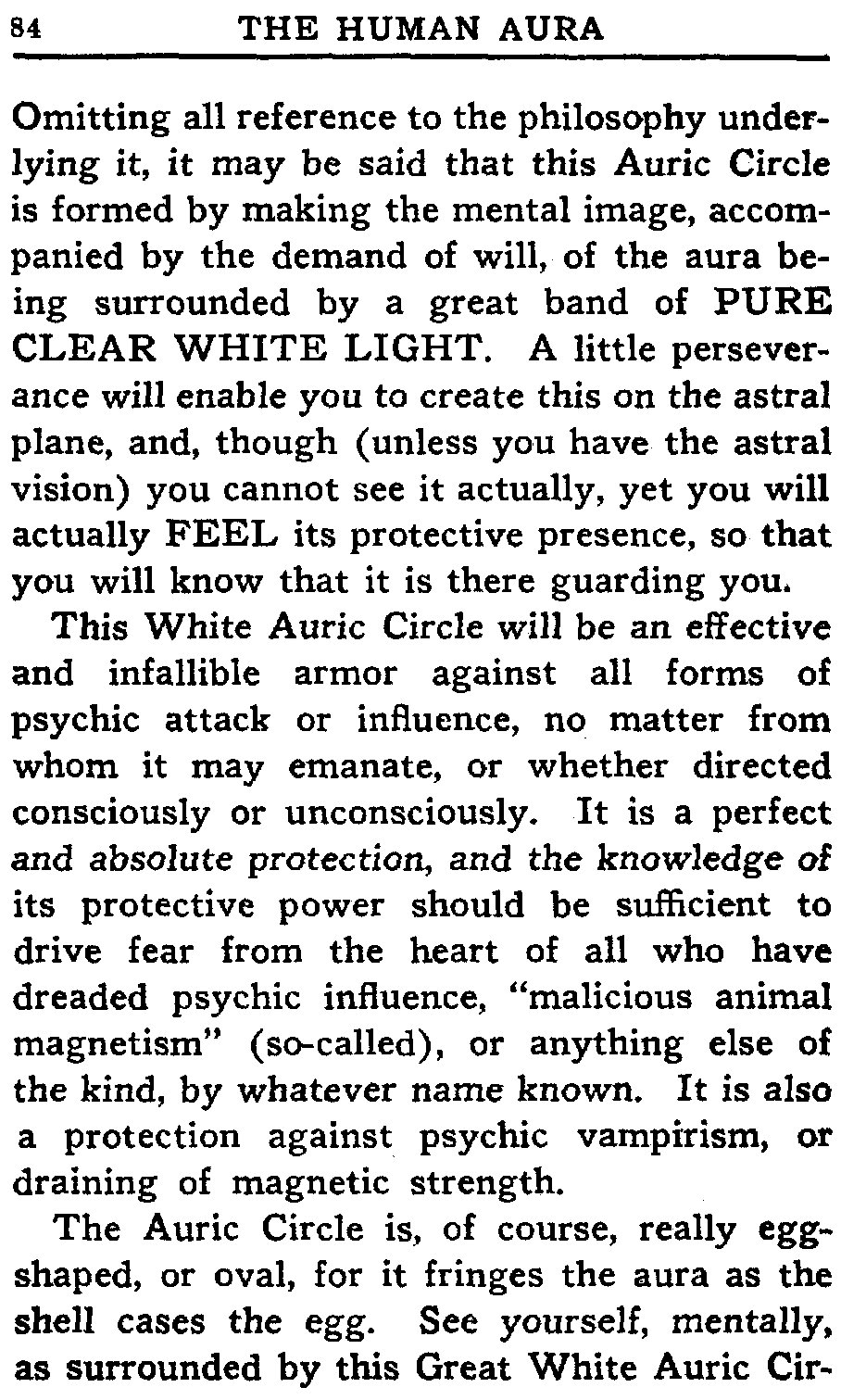 This White Auric Circle will be an effective and infallible armor against all forms of psychic attack or influence, no matter from whom it may emanate, or whether directed consciously or unconsciously. It is a perfect and absolute protection, and the knowledge of its protective power should be sufficient to drive fear from the heart of all who have dreaded psychic influence, "malicious animal magnetism" (so-called), or anything else of the kind, by whatever name known. It is also a protection against psychic vampirism, or draining of magnetic strength.
