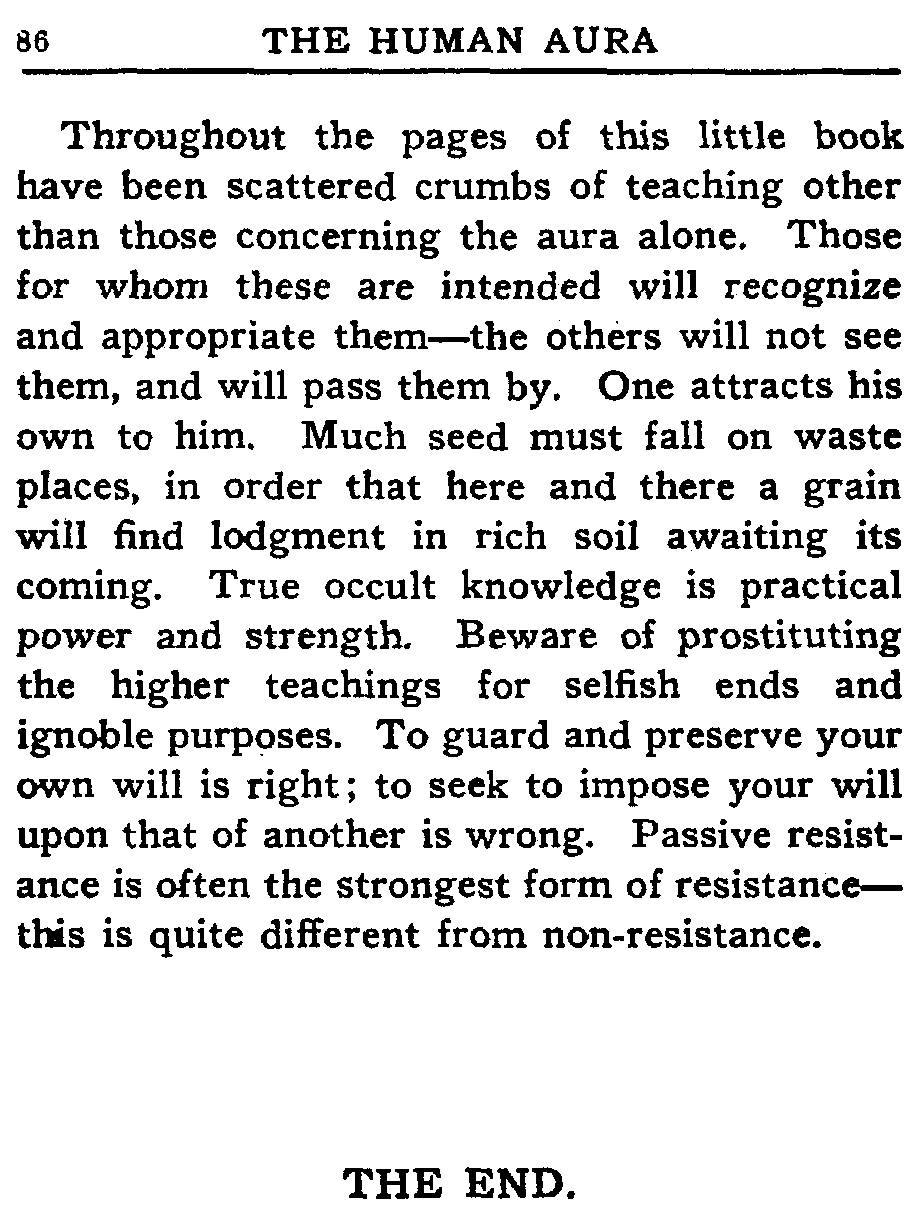 Throughout the pages of this little book have been scattered crumbs of teaching other than those concerning the aura alone. Those for whom these are intended will recognize and appropriate them—the others will not see them, and will pass them by. One attracts his own to him. Much seed must fall on waste places, in order that here and there a grain will find lodgment in rich soil awaiting its coming. True occult knowledge is practical power and strength. Beware of prostituting the higher teachings for selfish ends and ignoble purposes. To guard and preserve your own will is right; to seek to impose your will upon that of another is wrong. Passive resistance is often the strongest form of resistance—this is quite different from non-resistance.