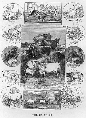 The Oryx, or Gemsbok, is a middle-sized species, dwelling in the same neighbourhood with the gnus. It is a heavy, stout animal, with a long bunch tail, and a pair of tapering slender horns, almost perfectly straight, and sweeping back towards the shoulders. It is truly a creature of the open desert plains; and can go for a long time without water. It is bold and dangerous—especially when wounded—and will give battle to the hunter even, it is said, when that hunter chances to be the lion himself!
