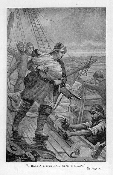 Before reaching the deck he drew the blanket over the child’s face, and then, with an activity no younger seaman could have surpassed, he sprang to the side of the ship and grasped a stanchion, to which he held on while he shouted to the crew of his boat, who had for safety’s sake pulled her off a few fathoms from the wreck, keeping their oars going to retain their position.