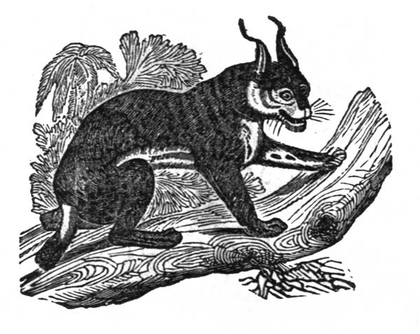 "Here's one more animal for you, Charley, called the Canada Lynx, which would make you laugh, if you[Pg 71] could see it alive and moving. It doesn't walk or run, but sticks up its back and jumps forward with all four feet in the air at once. If you apply that measuring rule of yours to it, you'll find it about three feet[Pg 72] long. It is a native of North America, and its skin is highly valued, so that eight or nine thousand of them are carried, every year to England. Muffs and tippets are made of the fur of the Lynx."
