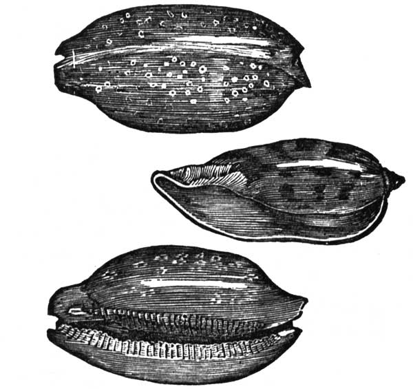 The first shell that Uncle Brown gave to Charley, was what is called a "money-cowry." It is an elegant shaped and beautifully marked shell and takes its name from the fact, that one species of them is used as money, both in Bengal and Guinea,[Pg 11] two places at a vast distance from each other. The value of these shells is small, in comparison with that of gold and silver, three thousand two hundred cowries amounting to a rupee, which equals fifty cents of our coin.