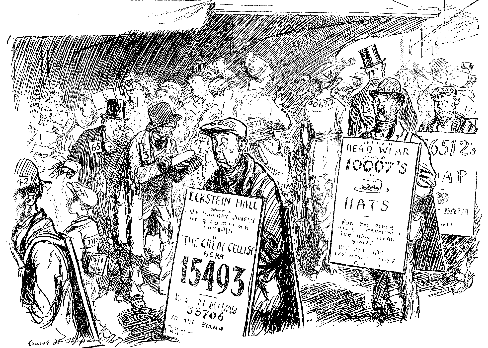 The scene (perhaps the best part of the whole show) was laid in "An Ancient Grove" adjacent to a German University. (The catalogue, peculiarly reticent about proper names, offers my memory no refreshment.) This "Ancient Grove," unchanged throughout the play, served a number of useful purposes. It made excuse for the intermittent apparition (otherwise inexplicable) of a little woodland figure that played upon a pipe. Its proximity to an hotel afforded occasion for meal after meal en plein air. Its proximity to a University Town encouraged the frequent passage of German students, vivacious and vocal; also the convenient appearance of any foreign resident or visitor at a moment's notice. Its Statue of Venus (fully draped) afforded an authentic incitement to the making of love. Its environs enabled Mr. Jerome to dispose of his puppets whenever their presence became undesirable. They simply said, "Let us stroll in the woods;" or "Come for a walk with me," and he was rid of them. Finally the "Ancient Grove" contained a central patch of boscage in whose cover one of the duellists, arriving on the terrain a little before the time, remained perdu in slumber, undisturbed by a loud conversation carried on within a few feet of him by all the other parties to the combat.
