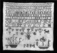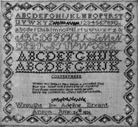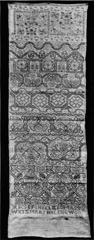 While the Puritan mother was scheming to add embroidery to her occupations, she did not forget to train each small maid of the family to the use of the needle. Ruth and Peace and Harmony and Mercy made their samplers as faithfully as though they were growing up under the shade of the apple trees of old England [20] instead of among the blackened stumps of newly cut forests.