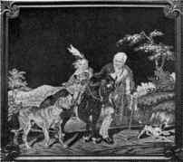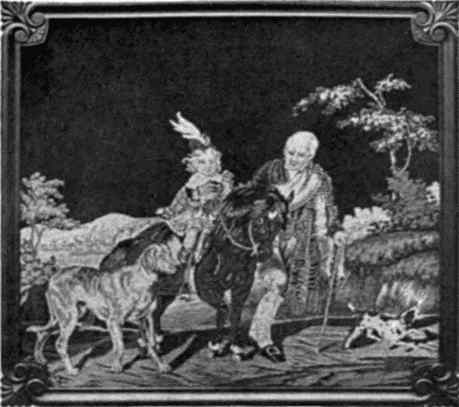Yet we must acknowledge there are many examples of Berlin woolwork which possess the merits of beautiful color and exact and even workmanship. Some of them are done upon the finest of canvas with silks of exquisite shadings, and where figures are represented the faces are [99] worked with silk in "single stitch," which means one crossing of the canvas instead of two, as in ordinary cross-stitch. The latter was of course better suited for furniture coverings, both in strength and quality of surface, while the method of single stitch succeeded in presenting a smooth and well-shaded surface, sufficiently like a painted one to stand for a picture. Indeed, veritable pictures were produced in this method and were effective and interesting. In these specimens the faces and hands, while worked in the same cross-stitch, were varied by being done on a single crossing of the canvas with one stitch, while the costumes and accessories of the picture were done over the larger square of two threads of the canvas, with the double crossing of the stitch.