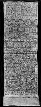 TESTER embroidered in crewels in shades of blue on white homespun linen. Said to have been brought to Essex, Mass., in 1640, by Madam Susanna, wife of Sylvester Eveleth.