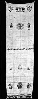 CHEROKEE ROSE BLANKET, made about 1830 of homespun wool with "Indian Rose" design about nineteen inches in diameter worked in the corners in home-dyed yarns of black, red, yellow, and dark green. From the Westervelt collection.