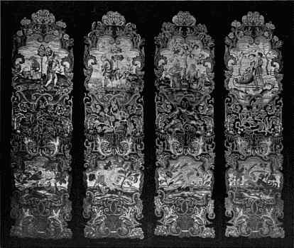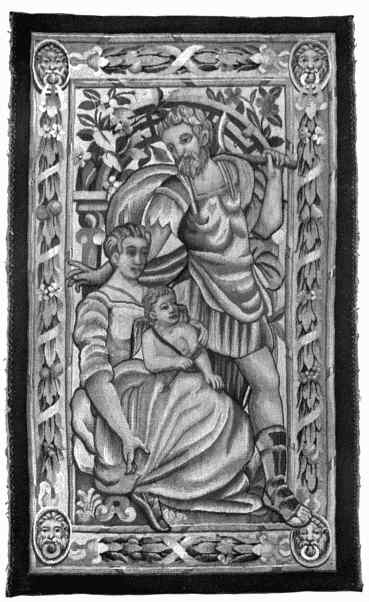 Except in the light of these treasures of art, it would be difficult to understand how far-reaching and comprehensive was the greed of beauty which possessed and distinguished the [129] centers of tapestry production. The museums of the world are made up of what remains of them. The pictures and tapestries, the weavings and embroideries, the carvings and metal work which the world is studying, belonged to the daily life of those past centuries. The stamp of thought and the seal of art were set upon the simplest conveniences of life. The very keys of the locks and hinges of the doors were designed, not by mere workers in metal, but by sculptors and artists who were pre-eminent for genius. It was in the spirit of this period that Benvenuto Cellini modeled saltcellars as well as statues, and his compeers designed carvings and gildings for state carriages, and painted pictures upon the panels. Painters of divine pictures designed cartoons and borders for tapestries, and wreaths and garlands for ceiling pilasters.