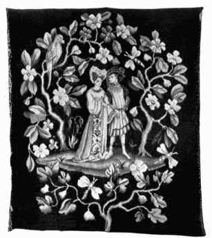 Not only the history, but the poetry and song of all periods are starred with real and ideal embroideries—noble and beautiful ladies, whose chief occupations seem to have been the medicining of wounds received in their honor or defense, or the broidering of scarfs and sleeves with which to [9] bind the helmets of their knights as they went forth to tourney or to battle. In these old chronicles the knights fought or made music with harp or voice, and the women ministered or made embroidery, and so pictured lives which were lived in the days of knights and ladies drifted on. The sword and the needle expressed the duties, the spirit, and the essence of their several lives. The men were militant, the women domestic, and wherever in castle or house or nunnery the lives of women were made safe by the use of the sword the needle was devoting itself to comforts of clothing for the poor and dependent, or luxuries of adornment for the rich and powerful. So the needle lived on through all the civilizations of the old world, in the various forms which they developed, until it was finally inherited by pilgrims to a new world, and was brought with them to the wilderness of America.