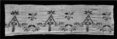 As a natural result, crewels were soon discarded in favor of silks, and natural extravagance, or national influence, led to the use of costly materials instead of the linens of English choice and preference. So the old flower embroidery of Bethlehem had a second birth. American girl art-students soon found their opportunity in the creation of applied design, and before embroidery had ceased to be a matter of representation of [112] flowers in colored silks, the flowers grew into restrained and appropriate borders, or proper and correct space decoration, and the day of women designers for manufacturers had come.