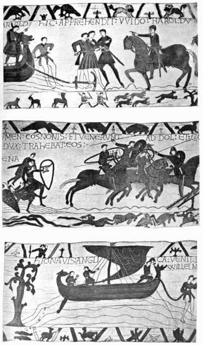 But this is only in one's mind. The reality is a more or less tattered strip of grayish-white linen, two feet in width and two hundred and thirty feet long, and along this frail bridge between the past and present march the actors in the great conquest. It seems but an inadequate pathway, but it has borne its phalanxes of men, its two hundred horses, its five hundred and fifty-five dogs and other animals, its forty-one ships, its numberless castles and trees, its roads and farms safely through all the intervening years from 1066 to 1919, and it still holds them.