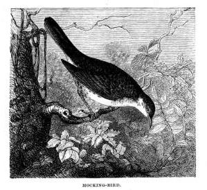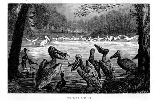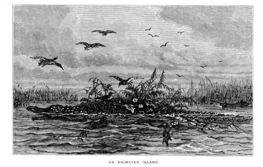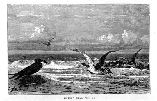We had plenty to amuse us. Crossing the bar at daybreak with a fair breeze, we ran along outside the line of islands which fringe the coast of Georgia, and which are devoted to the cultivation of “sea-island cotton.” The water teemed with fish, and birds innumerable came flying round us. The most remarkable of the latter were the scissor-bills, with black plumage, which went skimming along the surface, scooping up with their long lower mandible any unwary mollusc or fish of small size which came within their reach, and uttering every instant loud and discordant cries. Lejoillie told us that they were of the gull tribe, about twenty inches in length. The peculiarity of their beak consists in the lower mandible being considerably longer than the other into which it shuts. It is of an orange-red at the base, and deepens into black at the tip. To prevent the water rushing into its throat as it skims the surface with its beak, the bird is provided with a very small gullet. When unable to procure food by the method we saw it employing, Lejoillie said that it frequents the sea-shore as the tide is ebbing, where, finding mollusca with open valves, it inserts the lower mandible of its beak so as to prevent the shell from shutting; and then dashing it down on a rock, breaks it, and devours the inhabitant.